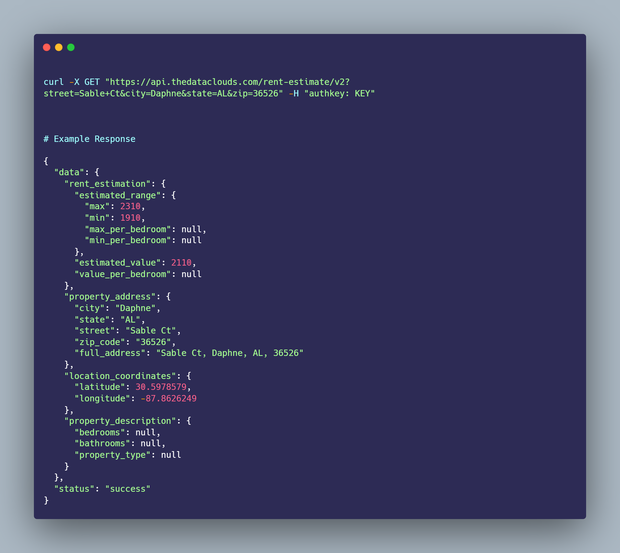 curl -X GET "https://api.thedataclouds.com/rent-estimate/v2?street=Sable+Ct&city=Daphne&state=AL&zip=36526" -H "authkey: KEY"Perfect for many Scenario